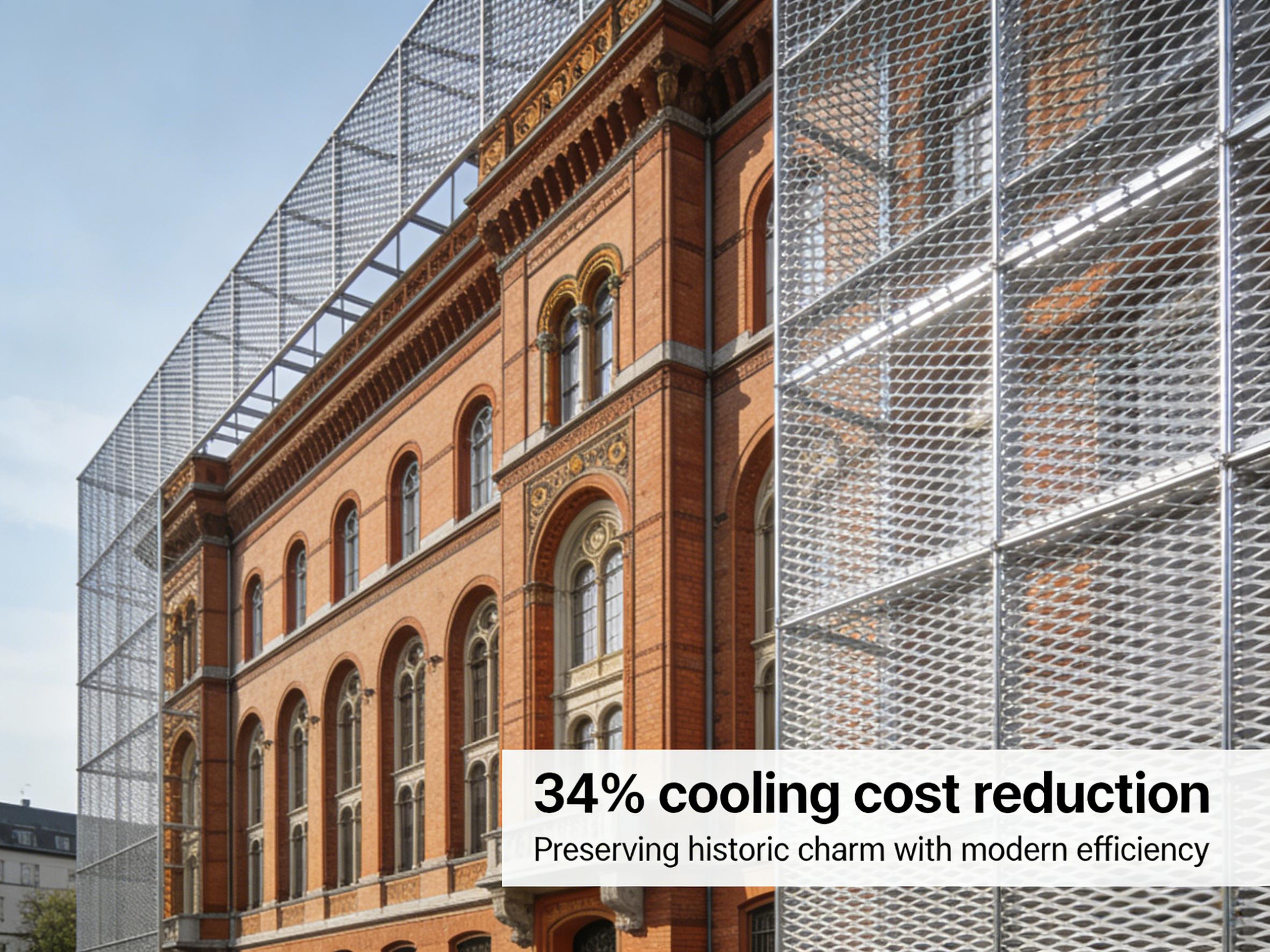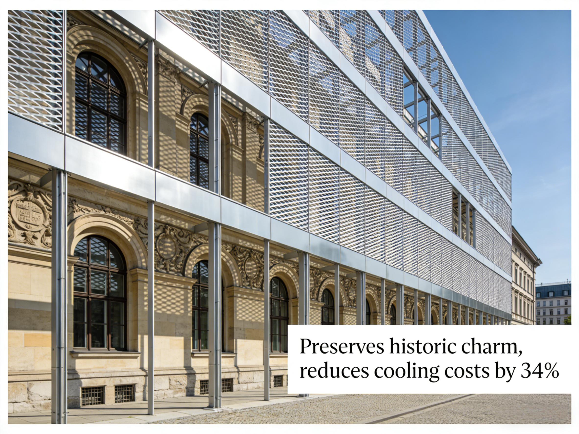 A historic Berlin building added an expanded metal outer layer, preserving charm while cutting cooling costs by 34%